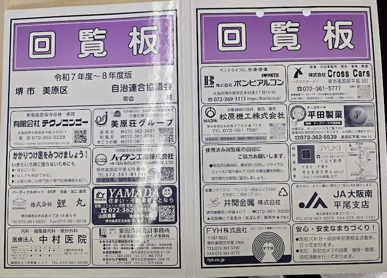堺市美原区の平尾・さつき野地区の回覧板に今年も掲載させていただきました😊✨✨✨