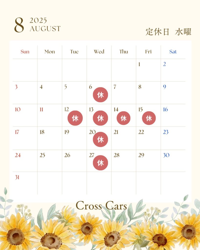 8月の休業日は、定休日の水曜日と 12日(火)~15日(金)がお休みになります🌻